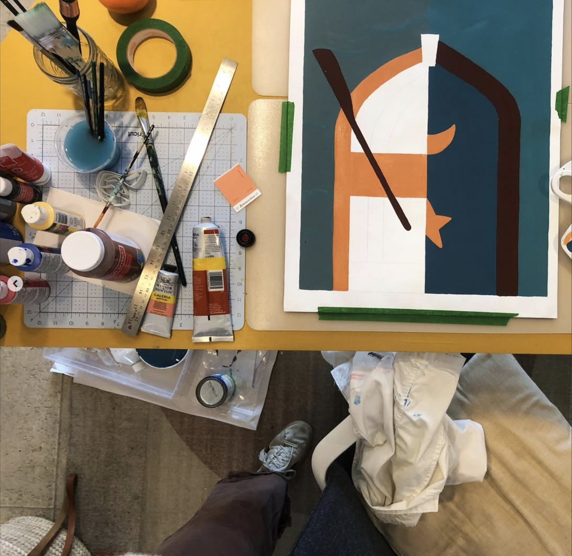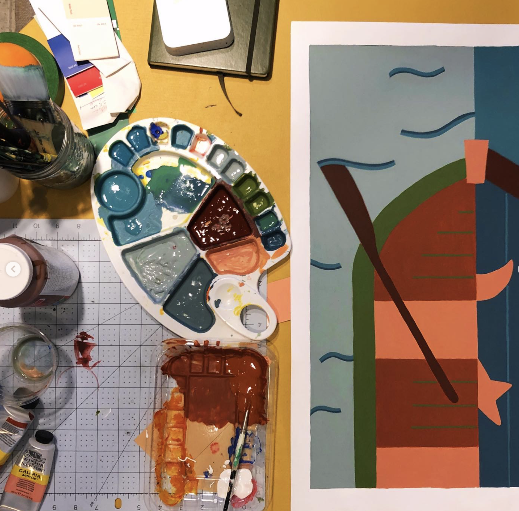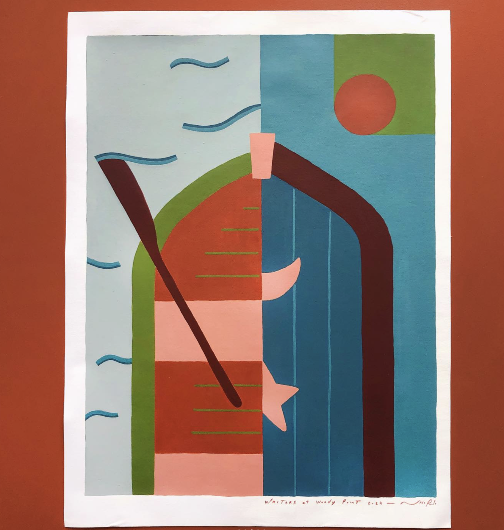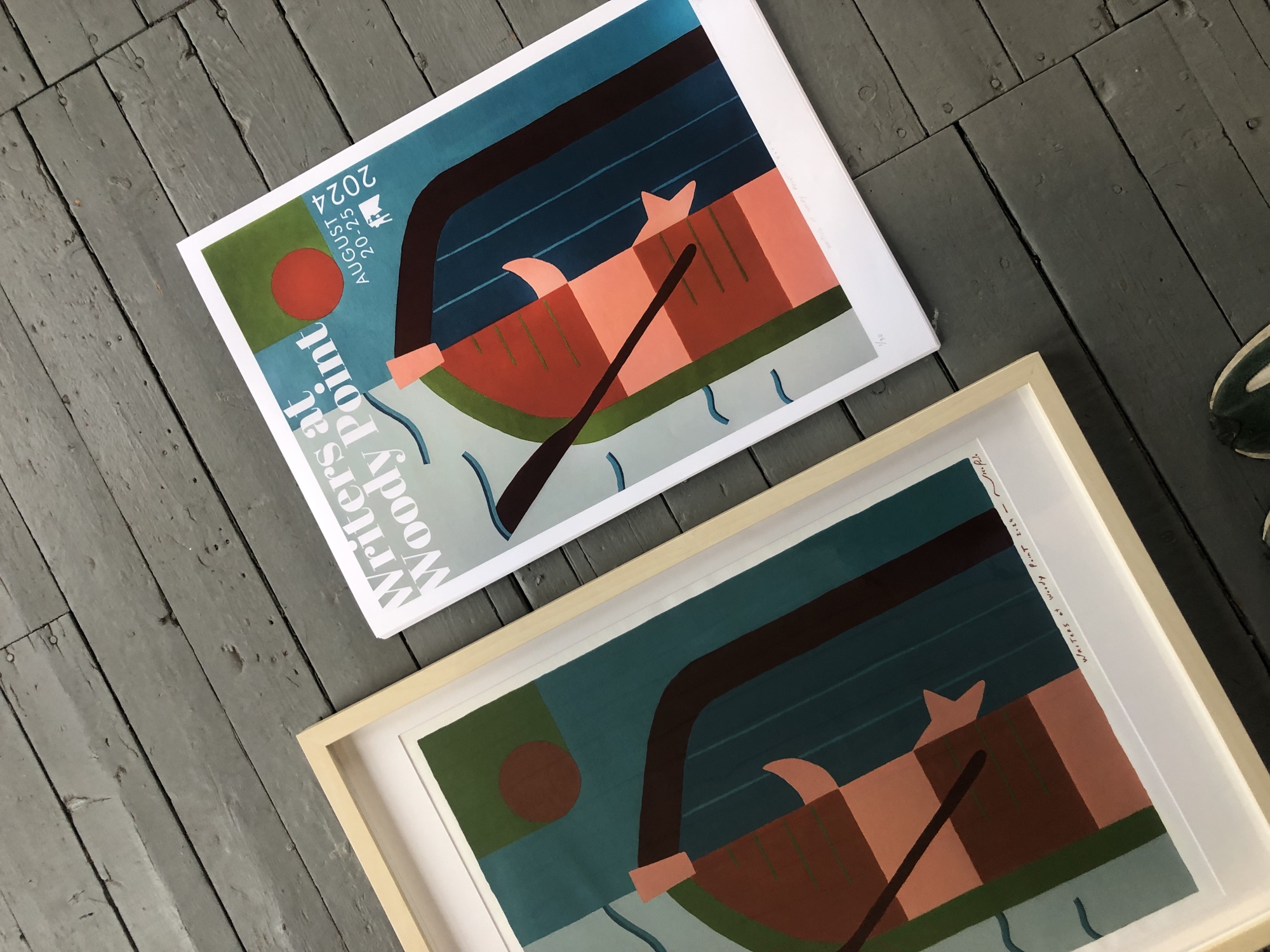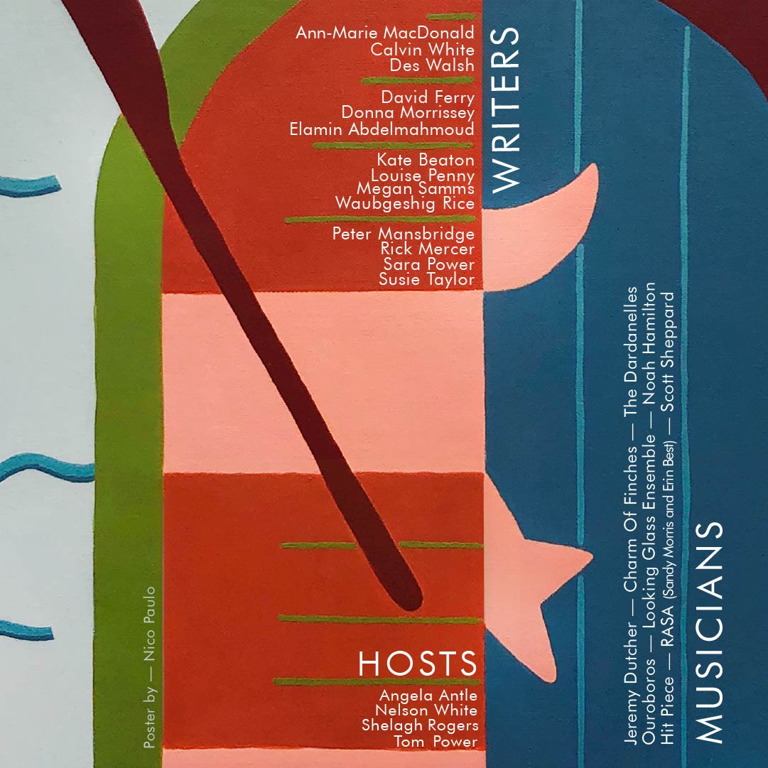 About the art ~~~~~~ • A geometric fauvistic interpretation of some of my favourite details that surround the identity of Writers at Woody Point. A minimal approach that mirrors heritage and movement, land and sea. You can see the half of the top central window of the Heritage Theatre with the crescent moon and the star cutout, symbols that go back in time and that relate to a place for gathering everyone. Then the Waves, Dory and the Oar, that represent the connection to fishing and coastal living as well as the way to get across the bay — for some the way to commute back and forth to the festival. The colors are based on observations during hikes around the area: green gardens grass, pitcher plant red, coral pink sunsets, many blues in the water in different weather conditions and lastly the tablelands burnt orange that gets darker with rain.